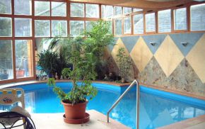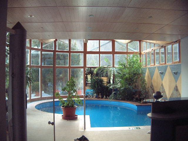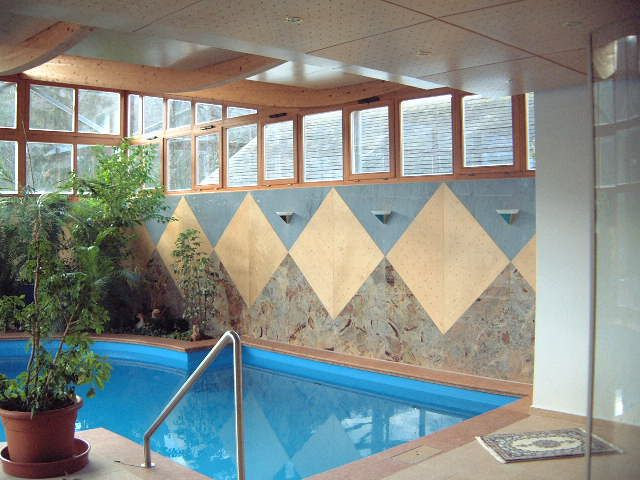 Das Bedürfnis nach Licht und Helligkeit - unter gleichzeitiger Wahrung der Privatheit der Bewohner - steht im Mittelpunkt dieses Projektes. Erfüllung findet es durch Oberlichtbänder an der Süd- und Westseite der Schwimmhalle sowie durch die vollflächige Glasfassade an der Ostseite in Richtung der großzügigen Terrasse. Im geschwungenen Dach - einer Holzleimbinderkonstruktion - vereint sich das Bedürfnis nach Licht mit der Anforderung das Gebäude in die umgebende Bebauung zu integrieren.Im Innenraum verzieren die Materialien Holz und italienischer Naturstein sowohl Boden- als auch Wandflächen in geometrischen Mustern. Den Kontrapunkt zu dieser starken Formensprache bildet die Bepflanzung der Grüninsel und der Tröge, durch welche die wohnliche Atmosphäre des Raumes noch zusätzlich bereichert wird.