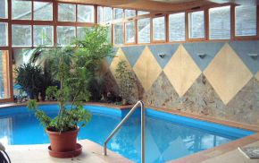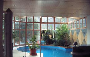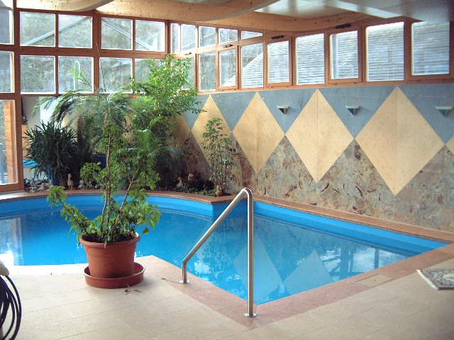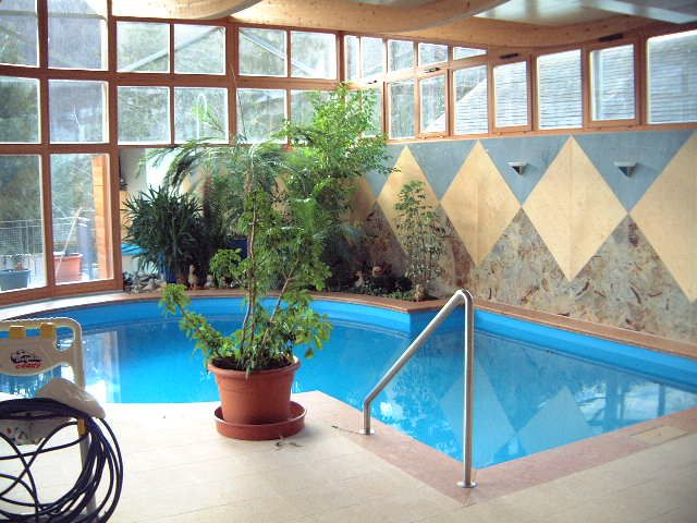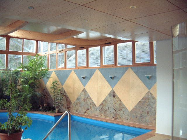 Das Bedürfnis nach Licht und Helligkeit - unter gleichzeitiger Wahrung der Privatheit der Bewohner - steht im Mittelpunkt dieses Projektes. Erfüllung findet es durch Oberlichtbänder an der Süd- und Westseite der Schwimmhalle sowie durch die vollflächige Glasfassade an der Ostseite in Richtung der großzügigen Terrasse. Im geschwungenen Dach - einer Holzleimbinderkonstruktion - vereint sich das Bedürfnis nach Licht mit der Anforderung das Gebäude in die umgebende Bebauung zu integrieren.Im Innenraum verzieren die Materialien Holz und italienischer Naturstein sowohl Boden- als auch Wandflächen in geometrischen Mustern. Den Kontrapunkt zu dieser starken Formensprache bildet die Bepflanzung der Grüninsel und der Tröge, durch welche die wohnliche Atmosphäre des Raumes noch zusätzlich bereichert wird.
